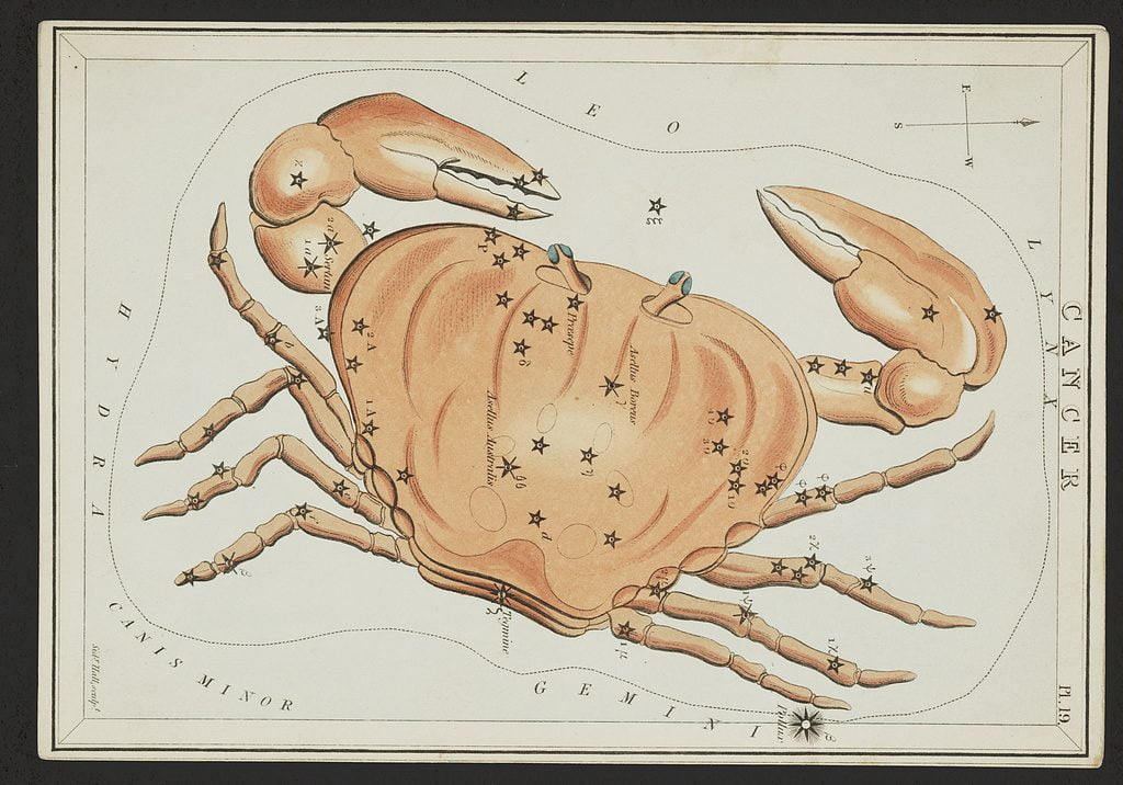 In Latin, Cancer is the word for Crab. In Greek astrology, the crab, sometimes a lobster, called Karkinos was stomped on by Hercules, and his remains were placed in the Cancer constellation by Hera.