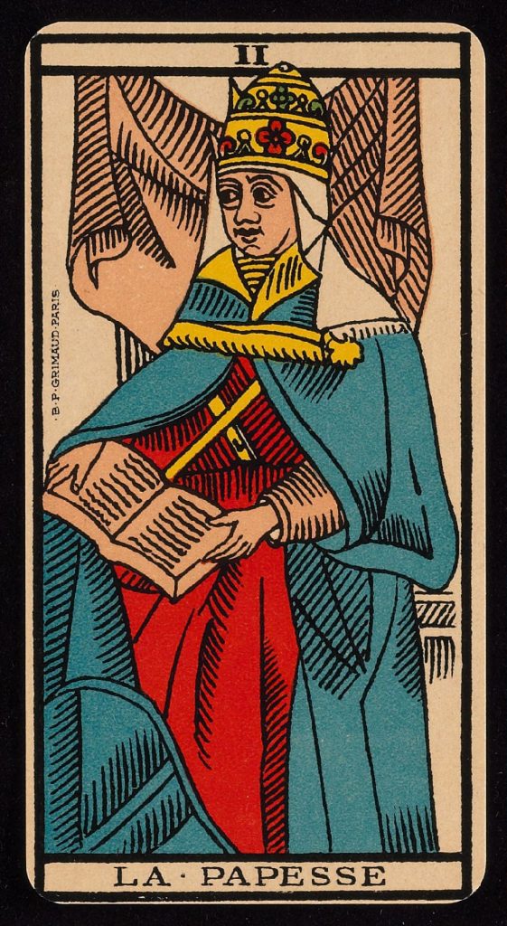The High Priestess transcends cultural boundaries. Universally, she represents a spiritual guide who traverses the threshold of the unseen, gaining wisdom and confidence before venturing out into the world. In the Tarot de Marseille, “La Papesse” (The High Priestess) sits cloaked in red and blue, signifying passion tempered by truth. Her hidden arms and book suggest a reserved nature, yet her presence demands quiet respect.