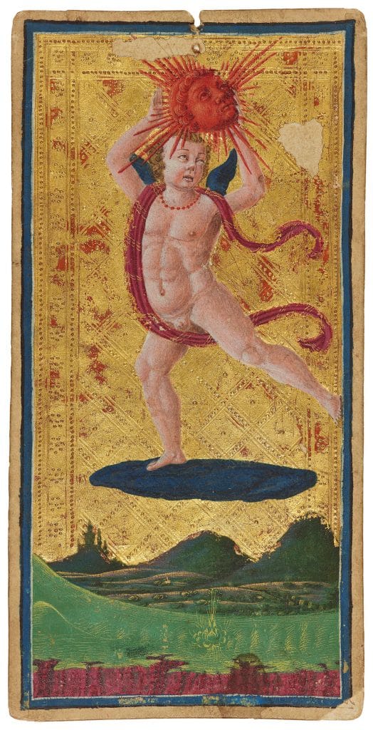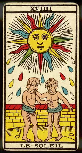 Le Soleil, or The Sun, in the later Marseille deck, shows two young children bathing in the rays of the bright sun. The simplistic imagery emphasizes the impact the sun has on us – energy, warmth, and joy. There need not be a horse, a ribbon, or a mask. These children thrive without. This minimalism reminds us that happiness and clarity often come naturally, without the need for complexity.
